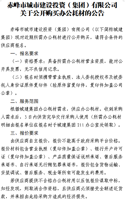 下一篇:赤峰市城市建設(shè)投資(集團(tuán))有限公司 關(guān)于公開購買辦公用品的公告