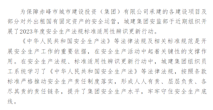 赤峰市城市建設(shè)投資(集團(tuán))有限公司開展安全生產(chǎn)法規(guī)標(biāo)準(zhǔn)適用性辨識更新工作